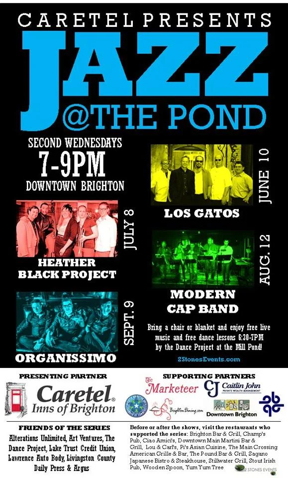 Bring a chair or blanket and enjoy FREE live music 7 to 9 pm and FREE Dance Lessons from The Dance Project beginning at 6:30 at the Mill Pond in downtown Brighton.